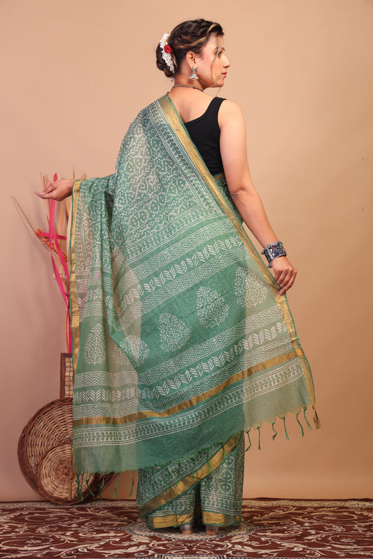 Anuttara Bhagalpuri Green Kota Cotton Hand Block Saree with Blouse_AFS1020-FS