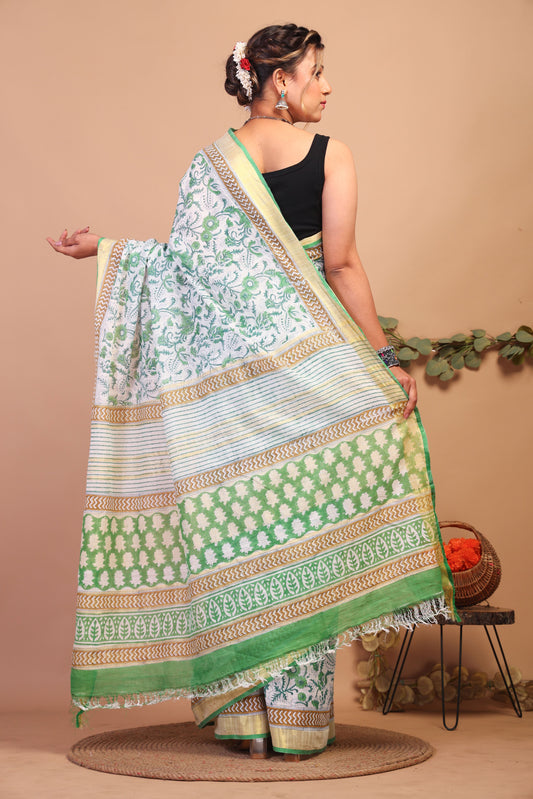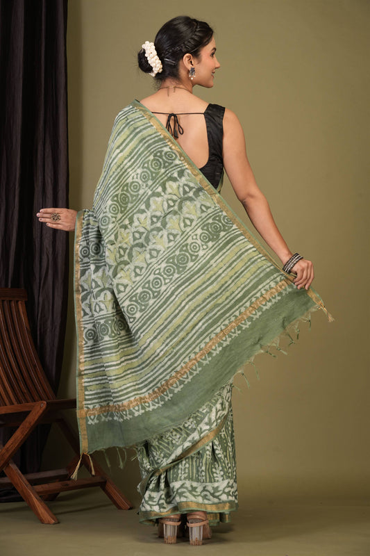 Anuttara Bhagalpuri Green Cotton Linen Hand Block Saree with Blouse_AFS1079-FS