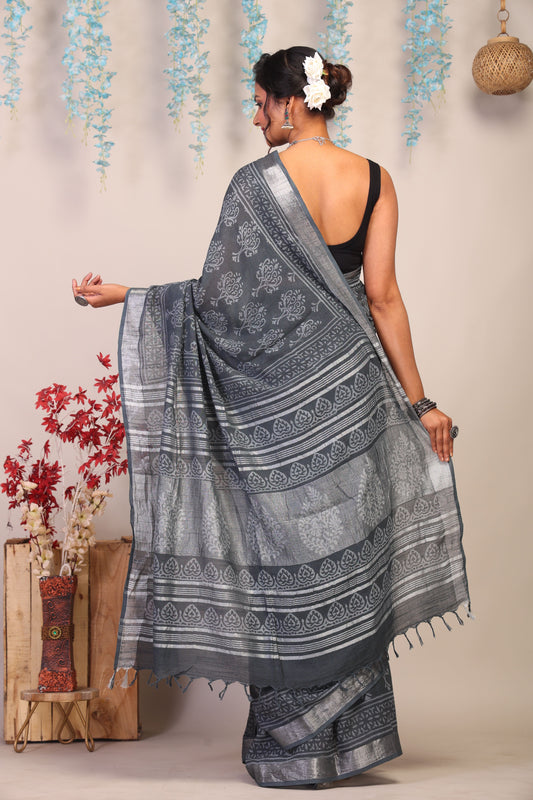 Anuttara Bhagalpuri Gray Cotton Linen Hand Block Saree with Blouse_AFS1087-FS