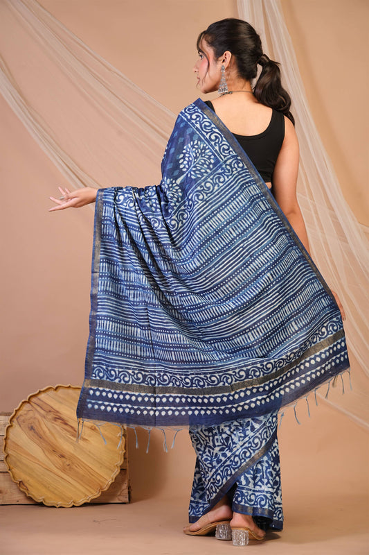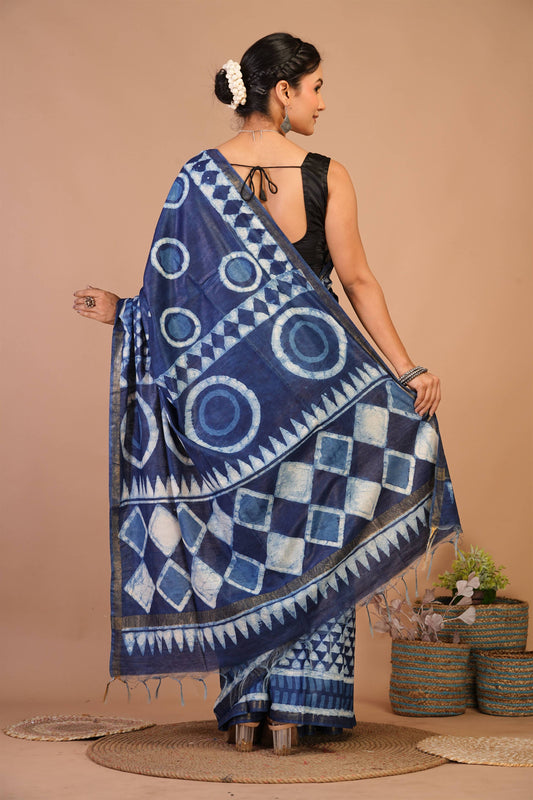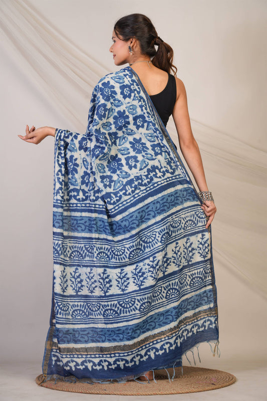 Anuttara Bhagalpuri Navy Blue Cotton Silk Dabu Print (Hand Block) Saree with Unstitched Blouse_AFS1405-FS