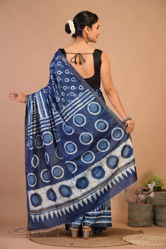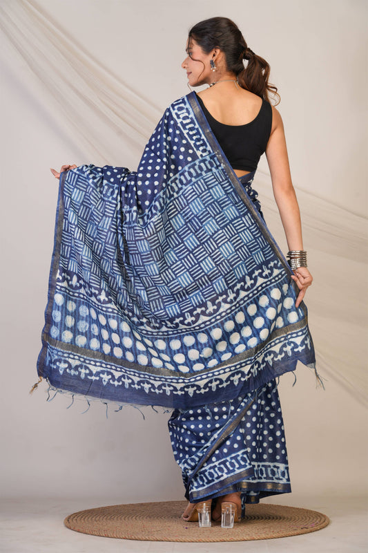Anuttara Bhagalpuri Navy Blue Cotton Silk Dabu Print (Hand Block) Saree with Unstitched Blouse_AFS1406-FS