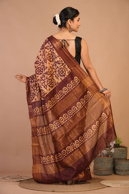 Anuttara Bhagalpuri Brown Cotton Silk Batik Print Saree with Unstitched Blouse_AFS1493-FS