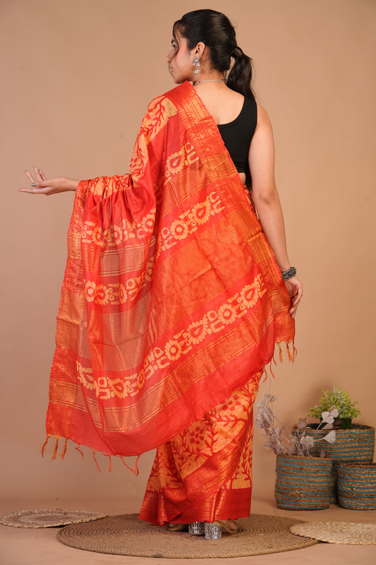 Anuttara Bhagalpuri Orange Cotton Silk Batik Print Saree with Unstitched Blouse_AFS1494-FS