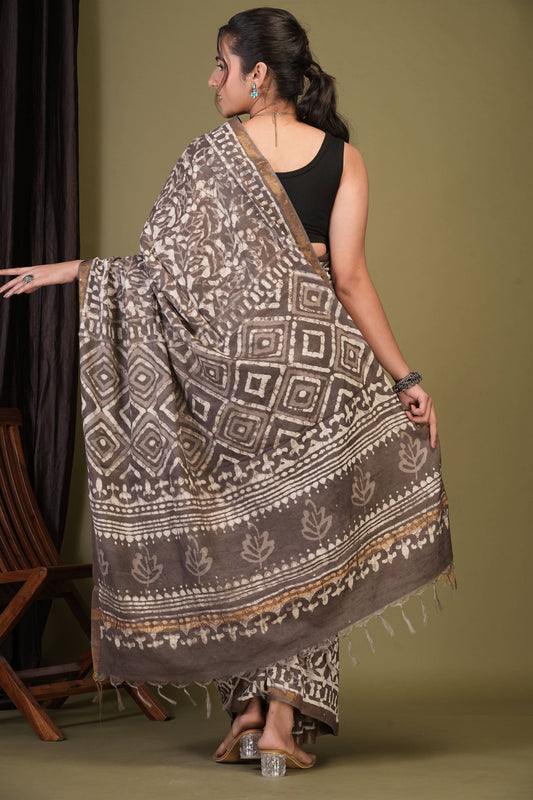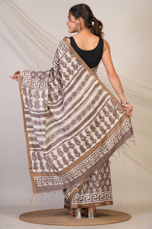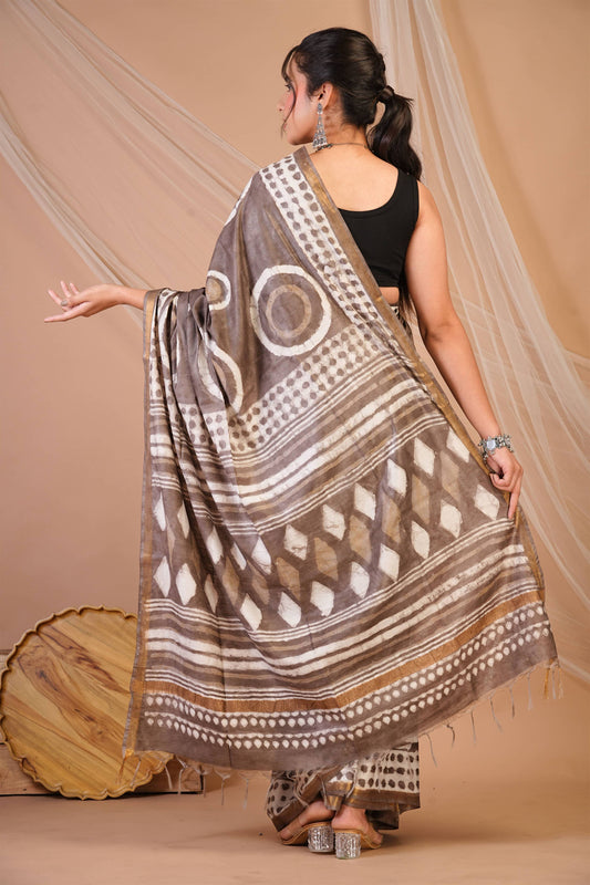 Anuttara Bhagalpuri Brown Cotton Silk Dabu Print (Hand Block) Saree with Unstitched Blouse_AFS1415-FS