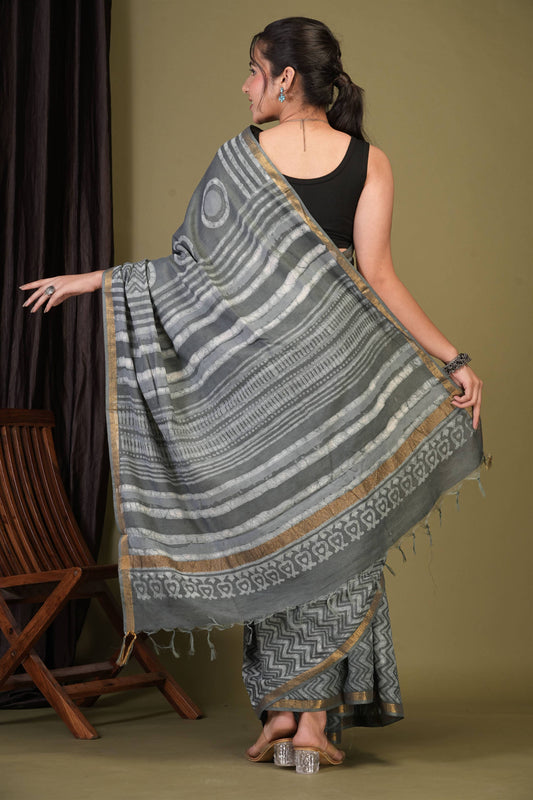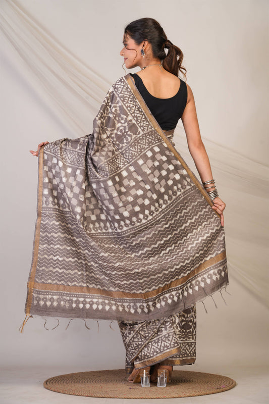 Anuttara Bhagalpuri Grey Cotton Silk Dabu Print (Hand Block) Saree with Unstitched Blouse_AFS1409-FS